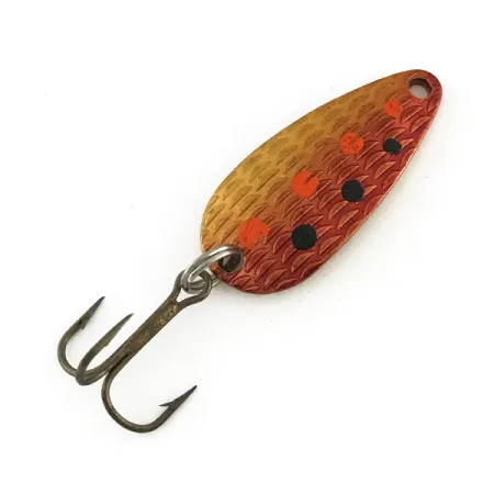 Grabada con una textura profunda de escamas, la superficie frontal de esta cucharilla presenta un vibrante acabado Red Trout que transiciona de un dorado brillante a un cálido rojo cobrizo. Con unas medidas de 1 1/4" (3 cm) y un peso de 1/8 oz (4,3 g) según la documentación, esta Thomas Cyclone es un señuelo clásico de fabricación estadounidense, catalogado bajo el código de producto 8306. El reverso muestra el estampado original nítido que identifica al fabricante y la designación del modelo S514, con el metal grabado con la inscripción 1/6 oz. Seis puntos pintados a mano (tres naranjas y tres negros) proporcionan el contraste visual distintivo necesario para este perfil de color específico. Provista de sus componentes originales, incluyendo una anilla abierta robusta y un anzuelo triple afilado, la cucharilla está en condición 5/5. El nivel de detalle en el trabajo del metal es característico del control de calidad mantenido por la compañía Thomas en EE. UU.