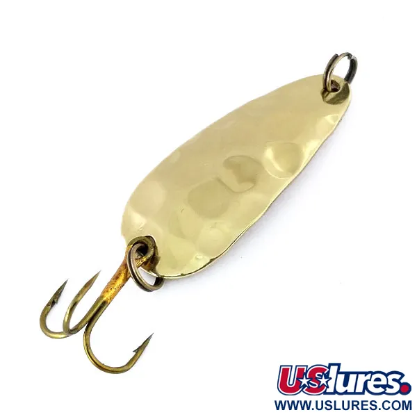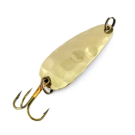La inscripción estampada a mano en el reverso de esta cucharilla de latón reza "RICHARDS 1/5 OZ CANDU IT", un tributo personal al fundador Richard Shubert, quien estableció la marca Thomas a mediados de la década de 1940 tras llegar a los EE. UU. desde Checoslovaquia. Catalogada bajo el código de producto 10715, el señuelo tiene un peso físico de 5 g (3/16 oz) y una longitud total de 4 cm (1 1/2"). Una textura martillada distintiva cubre la cara convexa, proporcionando una estética tradicional para el lanzado o curricán. Los componentes consisten en un anzuelo triple bronceado y dos robustos anillas abiertas, todos los cuales permanecen excepcionalmente limpios, contribuyendo a una calificación de estado de 5/5 para este ejemplar vintage. Estas superficies de latón pulido preservan el brillo original y la nitidez de los grabados, honrando a un fabricante que vino a América para cumplir su sueño de producir aparejos de pesca de calidad.