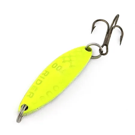 El grabado 'RIDER X700' en la cara metálica identifica a esta pieza como un elemento esencial de la colección Thomas. Con un recubrimiento en amarillo fluorescente de alta visibilidad, su cuerpo de 3,5 cm (1 1/2") está diseñado para destacar al lanzar en condiciones de poca luz o aguas turbias. El reverso presenta el logotipo de Thomas troquelado junto a la especificación de peso de 7 g (1/4 oz), destacando su fabricación en EE. UU. y su robusta construcción de metal grueso. Un resistente anzuelo triple está sujeto mediante una anilla abierta, reflejando el estado impecable y bien conservado de este ejemplar con una condición de 5/5. Catalogado bajo el código de producto 23223, el señuelo ofrece un perfil compacto que facilita la distancia durante el lance.