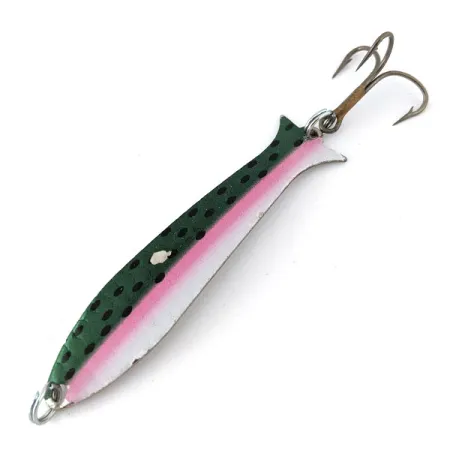 El cuerpo de metal estampado de 6,5 cm (2 1/2") de este señuelo presenta un detallado patrón de Trucha Arcoíris sobre una base de plata pulida. Diseñada principalmente para el curricán, esta Thomas Speedy Shiner (código de producto 14383) pesa 5 g (3/16 oz) y mantiene un perfil estilizado que imita a la perfección a un pez pasto. El acabado frontal destaca por un lomo verde oscuro con motas negras, una marcada línea lateral rosada y una parte inferior blanca. Al girar la cucharilla, se observan los cuños del fabricante y la especificación del peso grabados con claridad en el metal plateado, junto al logotipo del águila. Este ejemplar se encuentra en un estado excelente (5/5), conservando intactos tanto la pintura como los componentes. Viene equipada con anillas abiertas originales y un anzuelo triple bien afilado, cumpliendo con los estándares de calidad de los señuelos Thomas fabricados en EE. UU. para la pesca de truchas y salmónidos.