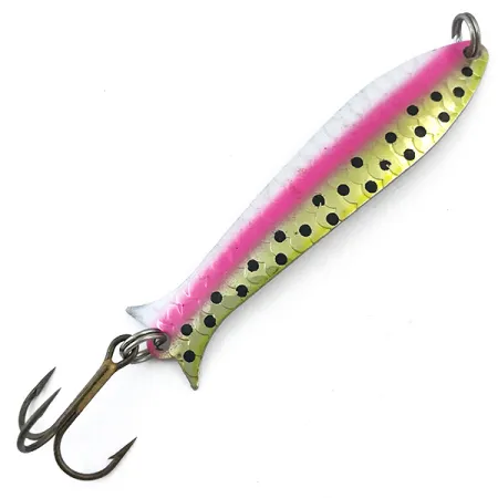 Troquelada en el reverso con el logotipo clásico y la designación de peso, esta cucharilla de 6,5 cm (2 1/2") hace gala del duradero niquelado sinónimo de la fabricación estadounidense de Thomas. El acabado Trout / Nickel es especialmente llamativo, ya que combina una audaz línea lateral rosa neón con detalles de escamas de color verde dorado y una serie de puntos negros intensos. Con un peso de 5 g (3/16 oz), el señuelo está fabricado específicamente para el curricán, utilizando un perfil delgado y alargado para maximizar la visibilidad en diversas condiciones de luz. Este ejemplar concreto, con el código de producto 5040, se encuentra en un estado 5/5, con la pintura y los componentes excepcionalmente bien conservados. Está montado con dos fuertes anillas abiertas y una potera afilada en la cola, lo que subraya la construcción de calidad que se espera de un señuelo vintage fabricado en EE. UU.