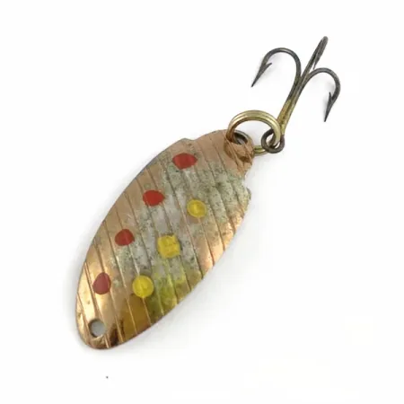 Un patrón de estrías diagonales define la cara de esta cucharilla de tono cobre, proporcionando una superficie texturizada para sus puntos rojos y amarillos aplicados a mano. Con una longitud de 4 cm (1 1/2") y un peso de 5 g (3/16 oz), esta Tommen Dolly fue fabricada en EE. UU. y lleva el código de producto 23684. El señuelo está equipado con un anzuelo triple unido mediante una anilla abierta, mientras que un único orificio de montaje se sitúa en la punta cónica. En un estado de conservación 4/5, los acabados de metal y pintura presentan un suave aspecto envejecido que confirma su carácter vintage. Una sencilla anilla abierta conecta los herrajes traseros al cuerpo de metal estampado.