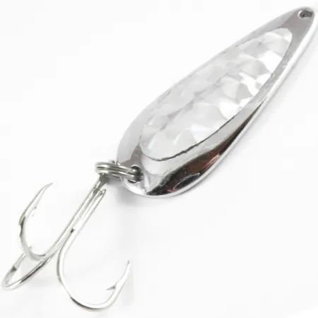 El niquelado brilla intensamente en esta Tony Accetta 3 H, captando la luz a través de su distintiva superficie texturizada de prisma. Con un peso de 11g (2/5oz), esta cucharilla de fabricación estadounidense presenta un perfil clásico de lágrima que mide 4,5cm (1 3/4"). Los coleccionistas apreciarán el estado 5/5, que destaca la integridad preservada del metal y los herrajes. La construcción incluye una anilla abierta resistente unida a un anzuelo triple afilado, diseñado específicamente para técnicas de lanzado. Este espécimen en particular, identificado con el código de producto 3728, muestra la artesanía clásica que convirtió a Accetta en un elemento básico en las cajas de pesca de mediados de siglo. El panel interior facetado está diseñado para maximizar el destello desde varios ángulos durante una recogida constante.