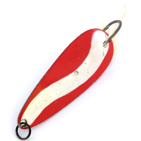 Un patrón de esmalte ondulado rojo/blanco cubre el lado convexo de esta cuchara niquelada, un diseño sinónimo de la pesca estadounidense de mediados de siglo. Identificada con el código 10607, esta Tony Accetta Weed Doger pesa 1/3oz (10g) y mide 2 1/4" (5,5cm). El lado cóncavo revela una marca estampada "TONY ACCETTA" nítida y un anzuelo simple equipado con un trailer de pluma amarilla sujeto por hilo rojo. Para facilitar la pesca en vegetación densa, el herraje incorpora un protector de maleza de alambre. En condición 4/5, la cuchara muestra ligeras marcas de manipulación que hablan de su historia, mientras que el metal permanece brillante y la pintura es vívida. Un simple anclaje negro está unido al ojal delantero para la conexión de la línea.