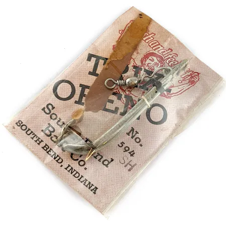 Con una longitud de 4,5 cm (1 3/4"), este ejemplar específico representa la variante No. 594 para caña de mosca del clásico South Bend Trix-Oreno. Resguardado en su sobre de papel cristal original con gráficos en rojo de South Bend, Indiana, el cuerpo de metal plateado se mantiene sin usar y ofrece una visión de la innovación en aparejos de la década de 1940. Este señuelo de 2 g (1/16 oz), catalogado bajo el código de producto 17393, cuenta con un accesorio de goma tipo 'pork rind' diseñado para atraer a los peces desde pozas profundas y oscuras durante los calurosos días de verano. La ingeniería de South Bend permitía que esta pieza descendiera con un aleteo similar al de un insecto vivo, mientras que un simple movimiento de la caña provoca que se sumerja y nade como un pequeño pez. Los herrajes incluyen un esmerillón delicado y un anzuelo del número 1, seleccionados específicamente para reducir la tensión en la caña de mosca en comparación con las cucharillas convencionales. En el reverso del empaque, South Bend detallaba los tres estilos distintos disponibles para el tamaño de caña de mosca, señalando que el modelo 594 se suministraba intencionalmente con la tira de goma en lugar de una hoja metálica.
