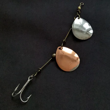 Las paletas de níquel y cobre proporcionan el contraste visual principal en este ejemplar de 1/4oz (7g). Con dos acabados metálicos distintos grabados con el número 2, la cucharilla doble Vintage Luxon 2 utiliza paletas de lágrima dispuestas en tándem sobre un armazón rígido de alambre color latón. Con una longitud de 4" (10cm), esta rareza de fabricación estadounidense muestra el diseño funcional por el cual LUXON era conocida, enfatizando la durabilidad en su construcción de alambre. El ensamblaje está rematado con cuentas de latón y lazos doblados con precisión que sujetan los componentes sin añadir peso innecesario. Identificado con el código de producto 22217, el señuelo se mantiene en excelente estado, con las superficies metálicas conservando su brillo original, lo que le otorga una calificación de estado de 5/5. El anzuelo triple está sujeto mediante un lazo estándar, garantizando que los herrajes originales en tono plateado sigan siendo el punto focal de la construcción.