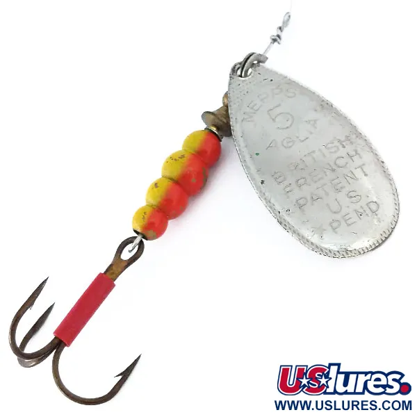 Los acabados plateados en la pala de lágrima sobredimensionada caracterizan a esta Vintage Mepps Aglia 5 (1970s), identificada por el código de producto 11019. Con un peso de 1/2 oz (14 g) y una medida de 3 1/4" (8,3 cm), este ejemplar presenta la clásica cara de la pala estampada con "MEPPS AGLIA 5" e información de patentes que incluye marcas pendientes británicas, francesas y estadounidenses. El reverso de la pala está claramente marcado como "Made in France", lo que refleja la herencia del señuelo como un ensamblaje de componentes franceses para el mercado estadounidense. Su cuerpo consta de cuatro cuentas segmentadas pintadas con un patrón amarillo y rojo brillante, que termina en un anzuelo triple con acabado en bronce protegido por una funda de plástico rojo vibrante. Esta cucharilla está calificada con una condición de 5/5, mostrando una conservación excepcional de sus superficies metálicas y herrajes. La reputación de la Aglia se basa en su sistema de rotación cónica que interactúa con la corriente de agua, un diseño desarrollado por primera vez por Andre Meulnart en 1938. Cada parte de este señuelo de la década de 1970, desde el estribo de latón hasta el eje de alambre, se mantiene firme y es históricamente precisa.
