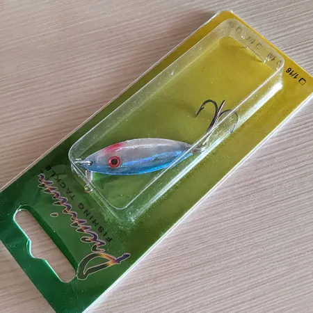 Con un peso de 7g (1/4oz), este señuelo presenta un degradado llamativo de azul a plata con un detalle carmesí alrededor del ojo. Con una longitud de 4,5cm (1 3/4"), el Wahoo Key Largo Swim'n Fin (Código de producto 16498) destaca por su fabricación artesanal en la República Dominicana utilizando componentes fabricados en EE. UU. Este modelo específico con sonajero se presenta en su embalaje original verde y dorado "Premier Fishing Tackle", lo que indica que se trata de un ejemplar sin usar. El cuerpo translúcido deja ver una lámina reflectante interna que imita las escamas, complementada con un anzuelo triple afilado y un punto de anclaje robusto en el morro. Originario de Wahoo Fishing Products en North Fort Myers, Florida, el señuelo cuenta con el acabado duradero característico del fabricante y herrajes de primera calidad diseñados para asegurar la clavada. El detalle del ojo rojo proporciona un punto de ataque de alto contraste frente al perfil estilizado e hidrodinámico del cuerpo.