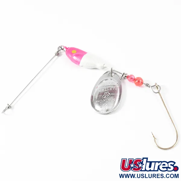 En la pala con acabado de níquel está claramente estampada la identificación de este Walleye Wonder 3, código de producto 3572, fabricado por South Bend. Con un peso de 17g (3/5oz), el señuelo presenta una distintiva cabeza bicolor con un frontal rosa brillante que transiciona a una sección trasera blanca, acentuada por un pequeño punto ocular amarillo. El diseño sigue el estilo clásico de un spinnerbait de horquilla, originario de los USA. Entre la pala del tamaño 3 y el anzuelo simple grande, el armazón de alambre está adornado con dos cuentas facetadas de color naranja-rosa y pequeños espaciadores de níquel. Este ejemplar se encuentra en excelentes condiciones, con una calificación de 5/5, mostrando una pintura impecable y componentes metálicos brillantes. El logotipo profundamente grabado en la pala permanece nítido y legible, reflejando la calidad de fabricación del material de pesca vintage de South Bend.