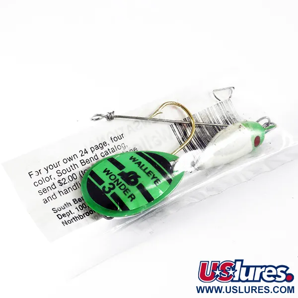 Llamativas rayas verdes y negras definen la hoja en forma de lágrima de este South Bend Walleye Wonder 3, grabada claramente con el nombre del modelo y el logotipo "SB". Con un peso de 17 g (3/5 oz), este ejemplar presenta un cuerpo blanco con la cabeza pintada de verde y un distintivo ojo rojo. El señuelo, identificado con el código de producto 3697, permanece sin usar en su envase original de plástico transparente, que incluye un folleto con instrucciones detalladas para lanzado, curricán y deriva. South Bend diseñó este aparejo para ser combinado con una lombriz natural o artificial en su anzuelo grande con acabado dorado. Detrás del cuerpo pintado, una serie de cuentas verdes y metálicas se asientan en el armazón de alambre para proporcionar espaciado y contraste visual. El envase conserva incluso la oferta vintage de un catálogo de 24 páginas de la época de la empresa en Northbrook, Illinois.
