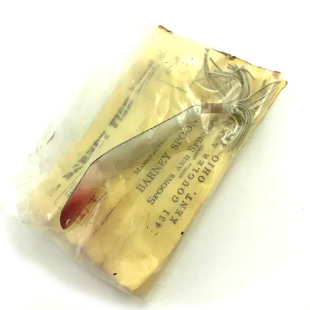 Pintura blanca que se funde en una punta roja vibrante cubre el cuerpo metálico cónico de este señuelo de 1/4oz (7g). Fabricada por Gougler Line Mfg. Co. en el 431 de Gougler Ave en Kent, Ohio, la Weedless Barney Spoon fue diseñada específicamente para navegar a través de vegetación densa. Este ejemplar de 2 1/4" (5,5 cm) cuenta con un anzuelo simple protegido por un protector antialgas metálico y está rematado con un faldellín de goma blanca de varios filamentos. Su estructura refleja un diseño versátil pensado para el lanzado, la cacea y el jigging, e incluso se utilizó en escenarios de pesca vertical en hielo. Identificado con el código de producto 5739, este señuelo está sin usar y se conserva en su envase transparente original.