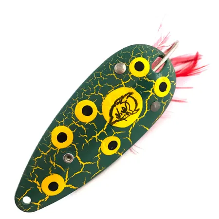 Acabada con un patrón clásico verde craquelado con motas de "rana" amarillas y negras, esta pieza muestra la estética icónica de la marca Eppinger. Esta cucharilla de 21 g (3/4 oz) mide 7 cm (2 3/4") y representa un tamaño versátil para pescar lucios o black bass en zonas con mucha vegetación. La cara frontal está puntuada por un círculo amarillo central que contiene el famoso logotipo de la cabeza de diablo Dardevle, sujeto por dos robustos remaches plateados. Al dar la vuelta al señuelo se descubre un vientre de tono plateado pulido y limpio con el sello de la ubicación de Dearborn, Michigan, marcando su historia tras el traslado de la empresa desde Detroit en 1959. Como variante antierba (código de producto 5434), cuenta con un anzuelo simple protegido por un protector de alambre metálico y adornado con un penacho de vibrantes plumas rojas. Este señuelo específico no ha sido usado y se mantiene en condiciones excepcionales. El nítido sello "MADE IN USA" en la parte posterior sirve como testimonio del legado de fabricación nacional de Lou Eppinger que comenzó en su sótano en 1906.