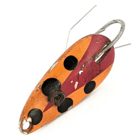 Con un peso de 6 g (3/16 oz), esta cucharilla vintage destaca por un patrón distintivo en rojo, negro y marrón sobre una base clásica de níquel. Con una medida de 3,5 cm (1 1/2"), la Weedless Dardevle Midget (Código de producto 12857) está fabricada con la característica forma cóncava que Eppinger produce desde 1906. La cara frontal presenta llamativos puntos negros sobre el diseño bicolor, mientras que el reverso muestra el nombre del fabricante estampado sobre la superficie de níquel pulido. Un anzuelo simple con protector de alambre anti-algas la identifica como una herramienta especializada para pescar en vegetación espesa. El acabado se mantiene en condición 4/5, mostrando superficies bien cuidadas que reflejan su origen estadounidense en Michigan. El robusto protector de alambre está diseñado para evitar enganches, una característica técnica acorde con la larga trayectoria de la marca creando herrajes duraderos para condiciones difíciles.