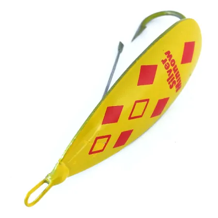 Un vibrante acabado amarillo con cinco diamantes rojos distingue a este ejemplar de la Weedless Johnson Silver Minnow, catalogado con el código de producto 11066. Con una longitud de 7 cm (2 3/4") y un peso de 17 g (3/5 oz), esta cucharilla ondulante está fabricada con una aleación exclusiva de cobre y zinc, diseñada intencionadamente para ser más gruesa en el centro y mantener la orientación del anzuelo. El reverso del señuelo tiene grabadas claramente las leyendas «JOHNSON'S SILVER MINNOW» y «MADE IN U.S.A.», lo que lo identifica como un artículo vintage de fabricación estadounidense. Su diseño antialgas se basa en un robusto protector metálico que resguarda el anzuelo simple fijo, permitiendo un uso eficiente en zonas de vegetación densa. En su estado actual, con una valoración de 5/5, tanto las superficies pintadas como el reverso metálico conservan su brillo y definición. Este diseño técnico permite que el señuelo oscile en un ángulo de 270 grados, generando destellos intensos, mientras que el cuerpo con peso central asegura un avance estable sin necesidad de quitavueltas adicionales.
