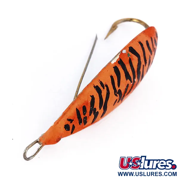 Una vibrante pintura naranja con rayas negras de tigre define esta cucharilla de 7 cm, una versión original de fabricación estadounidense del Weedless Johnson Silver Minnow UV. Con un peso de 17 g, esta cucharilla ondulante está construida a partir de una aleación especializada de cobre y zinc, diseñada con un centro más grueso para ayudar a que el señuelo mantenga una orientación de anzuelo constante. Este modelo vintage, código 10161, incorpora un acabado reactivo a los rayos UV que proporciona una firma visual distinta en escenarios de poca luz o aguas profundas. El anzuelo simple integrado se combina con un clásico protector metálico antihierbas, un sello distintivo del diseño desde que Louis Johnson pescó por primera vez en hábitats con vegetación en 1920. Mientras que la fabricación actual de esta marca se ha trasladado a China, este señuelo proviene de la muy codiciada era de producción de EE. UU. El estado está calificado como 4/5, exhibiendo un acabado bien conservado y herrajes robustos. La cucharilla está diseñada para balancearse de un lado a otro en un ángulo de 270 grados, una propiedad mecánica de su distribución de peso específica.