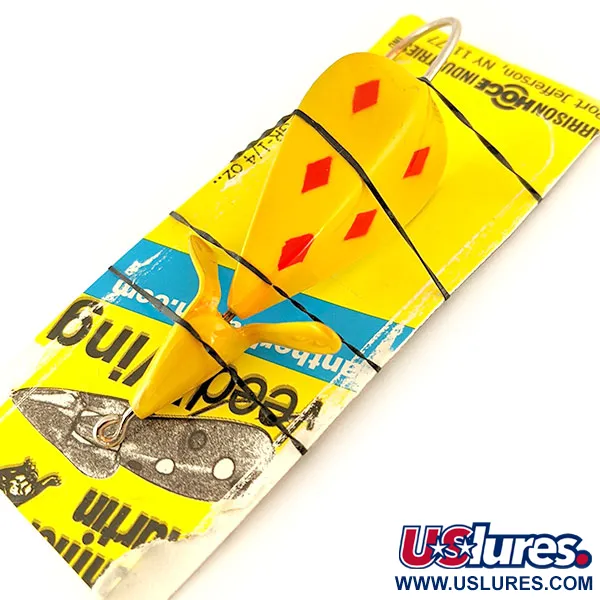 Adornado con un vibrante acabado amarillo y cinco diamantes rojos, este patrón Five of Diamonds es un elemento básico para la visibilidad en diversas condiciones de agua. Este Weedless Panther Martin Weed Wing de 14 g (1/2 oz) mide 7 cm (2 3/4") y presenta un diseño especializado para navegar en coberturas densas. Con el código de producto 12425, el ejemplar no ha sido usado, aunque el embalaje original muestra signos de edad y desgaste. Mientras que el señuelo está impecable, el cartón refleja su viaje desde Port Jefferson, NY, donde Harrison-Hoge Industries distribuía estas cucharillas de ingeniería italiana. El diseño se centra en un montaje de anzuelo simple antialgas, destinado a lanzarse en vegetación espesa o áreas con estructuras donde los enganches son una amenaza constante.