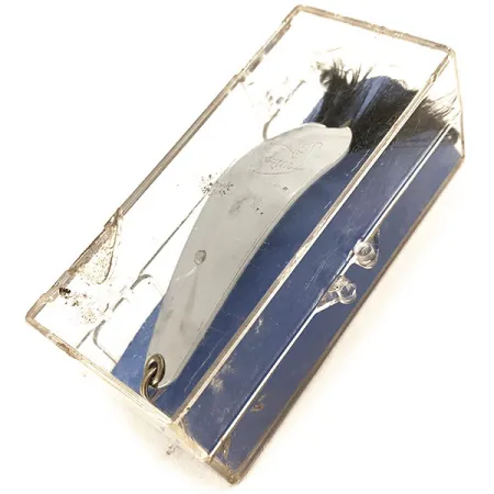 Un acabado niquelado define la estética de esta Weezel Rex Weedless Spoon, una cucharilla de lanzado de 12,5g (2/5oz) diseñada para pescar en vegetación densa. Fabricado por la Weezel Bait Co. en EE. UU. antes de que Eppinger asumiera la producción, este ejemplar representa una era específica en la fabricación de aparejos. Estampada directamente sobre el metal, la marca es clara y nítida. Con una longitud de 5,5cm (2 1/4"), la cucharilla cuenta con un robusto protector de maleza de alambre para proteger la punta del anzuelo. Plumas negras adornan la parte trasera, proporcionando un perfil visual distintivo que complementa el brillante acabado en níquel. El código de producto 11646 identifica este artículo sin usar, que se conserva en su caja original transparente con el fondo azul vintage. El metal y los componentes no muestran signos de antigüedad ni desgaste.