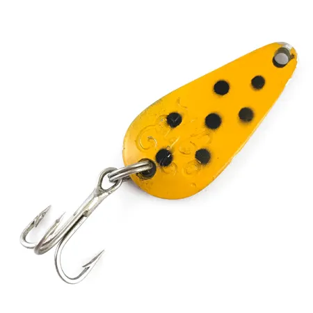 Con un vibrante acabado amarillo decorado con seis puntos negros, esta cucharilla ondulante Weller es un excelente ejemplo de la artesanía estadounidense de mediados del siglo XX. El reverso presenta una superficie de níquel pulido, que ofrece un fuerte contraste con la cara pintada. Con un peso de 3,7 g (1/8 oz) y una longitud de 3 cm (1 1/4"), este señuelo de perfil pequeño es una herramienta versátil para los pescadores de trucha o perca que utilizan equipos ligeros. Este ejemplar específico, identificado con el código 4873, mantiene una calificación de estado de 5/5, con la pintura y los componentes originales en excelentes condiciones. El equipo incluye un anzuelo triple afilado unido mediante un anilla de llavero estándar en la parte trasera, mientras que el ojal delantero permanece abierto para el nudo directo o el uso de un esmerillón. Fabricado en los EE. UU., este señuelo Weller refleja los diseños sencillos y eficaces que los coleccionistas valoran por su importancia histórica en la evolución de los señuelos metálicos americanos. Los sutiles detalles en relieve de la superficie pintada aportan la textura característica de estas clásicas cucharillas de metal troquelado.