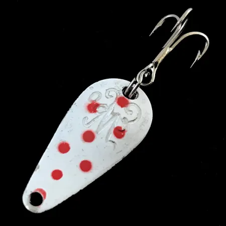 Puntos rojos esparcidos sobre un acabado de esmalte blanco definen la cara frontal de esta cucharilla de metal compacta de 3 cm. Identificado con el código de producto 5033, este señuelo Weller fabricado en EE. UU. pesa exactamente 3,7 g, encajando perfectamente en un equipo ligero. Un logotipo "W" grabado sirve como punto focal central en el lado pintado, característico de la artesanía vintage de los Estados Unidos. Mientras que el frente proporciona un alto contraste visual, el reverso está acabado en níquel pulido para un destello metálico distintivo. En un estado de conservación 5/5, la pintura permanece gruesa y los colores son vibrantes en todo el cuerpo. La cucharilla está equipada con una anilla abierta robusta y un anzuelo triple clásico, manteniendo su configuración original.