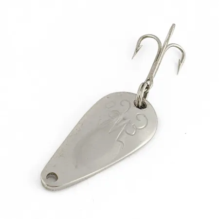 El niquelado proporciona un acabado limpio y brillante en la superficie estampada de este clásico de fabricación estadounidense, que muestra la artesanía histórica de la compañía Weller. Con solo 1" (2,6 cm) de longitud y un peso de 1/8 oz (3,5 g), la Weller Gypsy King Deluxe, código de producto 23042, es una pieza ligera poco común para colecciones vintage especializadas. El anverso de la cucharilla presenta un intrincado patrón grabado con elegantes filigranas alrededor de un emblema central estilizado, un elemento distintivo de la serie Deluxe. El reverso está pulido suavemente con un brillo de níquel intenso. El señuelo se conserva en un estado de 5/5 y no ha sido usado, manteniendo su integridad original desde el orificio para el sedal hasta el anzuelo triple de tono plateado. Estos componentes están sujetos por una anilla abierta resistente, conservando la construcción sólida típica de la producción estadounidense de mediados de siglo.