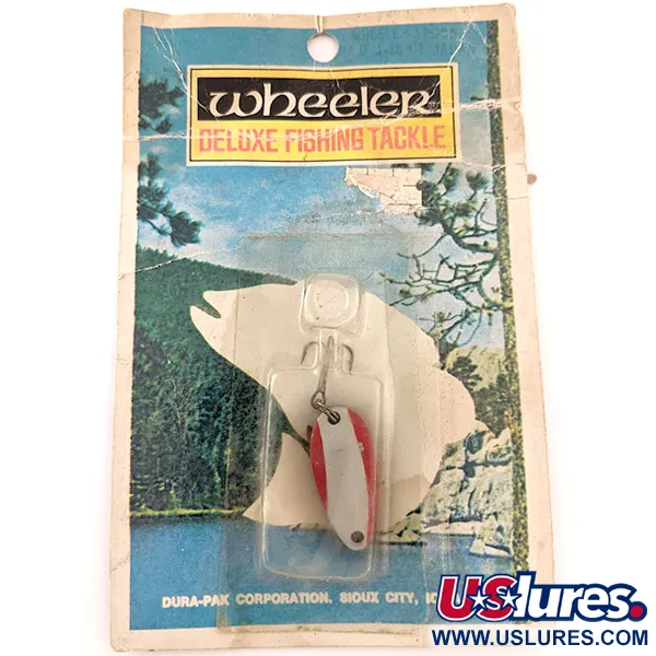 Japón es el origen de este hallazgo vintage, que luce un llamativo acabado en rojo y blanco a lo largo de sus 3,5 cm (1 1/2") de longitud. Con un peso de 5 g (3/16 oz), la Wheeler Spoon pertenece a la época de distribución de la Dura-Pak Corporation de Sioux City, Iowa. El ejemplar está catalogado bajo el código de producto 12101 y se conserva en su blíster original, que protege la pintura y los herrajes plateados. Al tener una calificación de estado de 6, el señuelo no ha sido usado y se presenta tal y como salió de fábrica. El cartón del encabezado muestra un gráfico de paisaje nostálgico típico de la línea Wheeler Deluxe Fishing Tackle. Una resistente anilla abierta conecta la cucharilla metálica con el anzuelo, diseñada para ofrecer total fiabilidad en sesiones de lanzado o curricán.