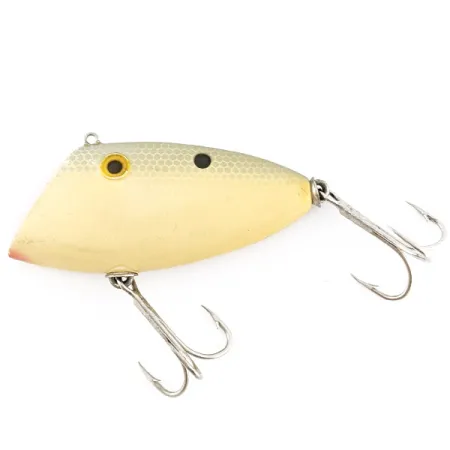 El acabado en color crema pálido de este cuerpo clásico de 2 1/2" (6,5 cm) se funde con un patrón de escamas de malla fina a lo largo del lomo. Con un peso de 1/2 oz (14 g), este Whopper Stopper Bayou Boogie (Código de producto 23278) destaca por su mentón con punta roja, un rasgo visual característico de muchos señuelos lipless de fabricación estadounidense. Los ojos amarillos pintados a mano con grandes pupilas negras ofrecen un punto focal de alto contraste, complementado por una única mancha oscura situada en el flanco hacia la cola. Fabricado en EE. UU., este ejemplar tiene una calificación de estado de 4/5, mostrando ligeras señales de su antigüedad mientras que los herrajes se mantienen intactos. Monta dos anzuelos triples de estilo original mediante argollas resistentes en la panza y la cola, lo que lo convierte en una excelente pieza para cualquier colección de artículos de pesca de mediados de siglo.