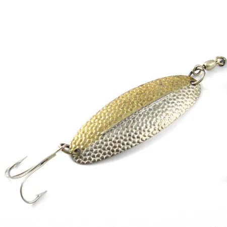 La textura martilleada en la hoja proporciona un perfil visual distintivo que los coleccionistas de cucharillas Williams reconocen de inmediato. Con el código de producto 1202, esta Williams Wabler presenta un acabado clásico dividido Silver / Gold. El baño de plata es un sello distintivo del compromiso de la marca con los acabados de alta visibilidad. Con un peso de 18g (2/3oz) y una longitud de 8cm (3 1/4"), el señuelo está diseñado para capturas importantes como el lucio y la lucioperca. Un nervio central elevado recorre la cucharilla, un detalle estructural que ayuda a mantener su orientación durante diversas velocidades de recogida. Este ejemplar fabricado en EE. UU. incluye su anzuelo triple original y un quitavueltas integrado. Su estado es un sólido 4/5, manteniendo el chapado un aspecto brillante y limpio.