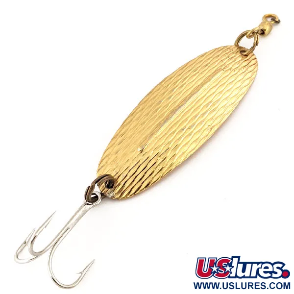 Con una longitud de 8,5 cm (3 1/4"), la distintiva cresta longitudinal de esta cucharilla fabricada en Canadá es su característica física más definitoria. Esta Williams Wabler, identificada con el código de producto 12654, presenta un acabado Oro clásico sobre una superficie texturizada diseñada para captar y reflejar la luz. Con un peso de 18 g (2/3 oz), el cuerpo metálico conserva un brillo impecable, obteniendo una calificación de estado de 5/5. El montaje consta de una potera plateada y un quitavueltas de color latón unido a la nariz. Los coleccionistas encontrarán el sello del fabricante claramente visible en el lado cóncavo, una marca distintiva de los estándares de producción de Williams. El diseño se centra en esa nervadura central elevada, que proporciona estabilidad al cuerpo metálico durante el lanzado o la cacea. Este ejemplar es un elemento básico de la historia del material de pesca canadiense, configurado específicamente para la pesca de lucio y lucioperca.