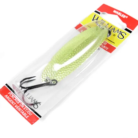 Con una longitud de 8,2 cm (3 1/4"), el Williams Wabler W60 cuenta con un acabado de panal verde claro sobre una base bañada en plata auténtica. Con un peso de 21 g (3/4 oz), esta cucharilla incorpora la característica nervadura longitudinal del fabricante, un diseño pensado para aportar estabilidad durante el lanzamiento o la cacea. Esta unidad, con código 1767, se encuentra sin usar en su blíster original rojo, blanco y amarillo. El baño de plata proporciona el destello reflectante que ha definido a Williams desde que se patentó este diseño canadiense. En el reverso del envase se menciona su origen en Sherbrooke, Quebec, Canadá. En la parte posterior monta un anzuelo triple de acabado oscuro, sujeto mediante una anilla abierta reforzada.