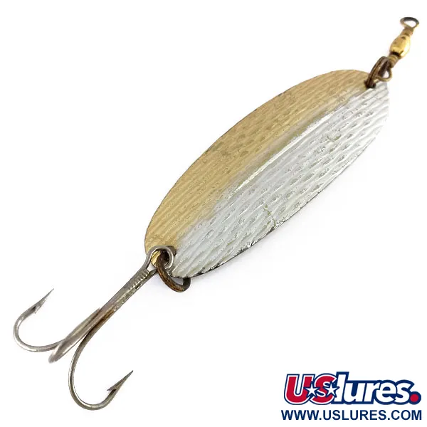 Un distintivo nervio longitudinal recorre el centro de esta cucharilla de 21 g (3/4 oz), una característica de diseño emblemática de la Williams Wabler W60 (código de producto 9849) que ayuda a mantener una trayectoria estable a varias velocidades de recogida. El acabado bicolor Silver / Gold se aplica mediante un proceso de chapado en metales preciosos auténticos, un sello distintivo de la fabricación canadiense de Williams que proporciona un destello excepcional para la pesca de lucio o lucioperca. Con una longitud de 8,2 cm (3 1/4"), el cuerpo presenta una textura de estilo martillado que consiste en numerosas pequeñas depresiones diseñadas para dispersar la luz en la columna de agua. El hardware incluye un robusto quita vueltas de latón en el enganche de la línea y un anzuelo triple afilado en el extremo posterior, ambos con evidencias de un uso previo cuidadoso. Con una calificación de estado de 4/5, el recubrimiento de metal precioso está bien conservado, mostrando solo un desgaste superficial menor por el tiempo pasado en una caja de pesca. Este diseño específico fue concebido para mantenerse equilibrado, utilizando el nervio estabilizador como quilla durante la recogida.