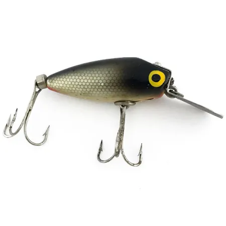Con el clásico patrón Smoky Joe, este ejemplar presenta un lomo oscuro, casi negro, que se degrada hacia un distintivo diseño de escamas en forma de panal en los costados. Este Woods Deep R Doodle Series 300 vintage, con código de producto 18001, es una pieza de la historia de la pesca estadounidense de los años 70. Fabricado en madera, su cuerpo de 2 1/4" (5,5 cm) tiene una silueta de lágrima diseñada para presentaciones en aguas profundas. La gran paleta de buceo metálica en tono plateado está fijada firmemente al morro con tres tornillos y cuenta con una anilla de sujeción robusta. Sus ojos están pintados en un amarillo de alto contraste con pupilas negras, un sello distintivo del diseño de señuelos de mediados de siglo. El acabado muestra signos de una vida bien aprovechada en el agua, con un desgaste natural en los herrajes y la panza, lo que le otorga una calificación de estado de 3/5. Equipado con dos anzuelos triples plateados, el señuelo pesa 2/5 oz (12 g). La Series 300 era un elemento básico para los pescadores que buscaban profundidad, y este modelo flotante muestra la artesanía de Wood's Lures de EE. UU.