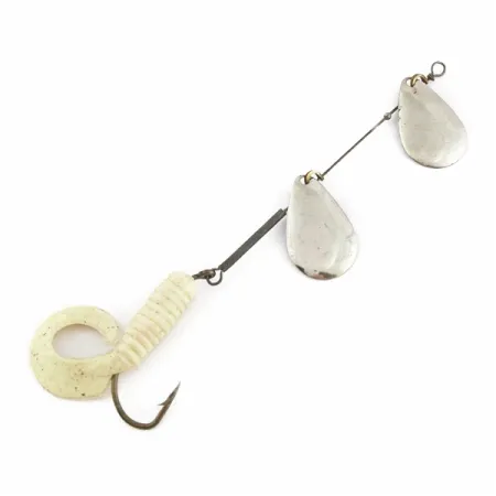 Dos palas niqueladas en forma de lágrima caracterizan el montaje superior de este aparejo en línea, proporcionando destellos constantes durante una recogida lineal. Con una longitud total de 13 cm (5") y un peso de 5 g (3/16 oz), este diseño es ideal para el lance ligero o el curricán en agua dulce. El acabado en níquel de las palas se combina con un vinilo de cola rizada blanco con sutiles destellos plateados para una mayor atracción visual. Se han colocado cuentas rojas de atracción en el armazón de alambre para separar correctamente las palas y proporcionar un punto de atención cerca de los estribos. Un anzuelo simple está montado con la cola de plástico blando anillada, que se sujeta al armazón mediante un robusto lazo de alambre. El fabricante Worth produjo estos componentes con un simple ojal en la cabeza para el atado directo de la línea o el uso de un pequeño imperdible. El estado general está calificado como 5/5, mostrando superficies metálicas limpias y un tráiler de plástico flexible. Catalogada bajo el código de producto 24502, esta configuración específica resalta la naturaleza modular de los diseños de cucharillas vintage.