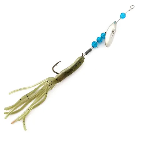 Los componentes de níquel y azul definen la identidad visual del modelo 20140, que representa un enfoque clásico del diseño de aparejos americanos de Worth. Con una medida de 11 cm (4 1/4") y un peso de 6 g (3/16 oz), el señuelo presenta una construcción distintiva tipo June Bug donde la paleta va montada en un brazo de alambre. Esta disposición específica es muy valorada por los pescadores por su arranque fiable, lo que asegura que la paleta niquelada gire suavemente sin trabarse. El montaje se acentúa con tres cuentas azules facetadas bajo la paleta y una sola cuenta a juego cerca del anclaje de la línea, proporcionando un contraste visual frente al brillo metálico. Un trailer de vinilo en color verde oliva translúcido con motas negras crea un perfil sutil y texturizado detrás de los herrajes. El anzuelo simple está perfectamente integrado en el cuerpo blando, y el conjunto se mantiene en un estado de conservación 5/5, con superficies limpias y materiales bien preservados en su totalidad. El diseño de Worth está específicamente desarrollado para técnicas que requieren un destello constante y una rotación uniforme.
