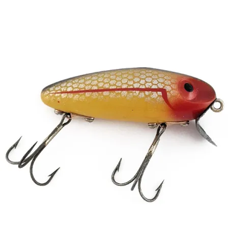 Los detalles de escamas plateadas cubren la mitad superior del cuerpo amarillo dorado en esta rareza vintage de fabricación estadounidense. El Wright & McGill Bug a Boo de plástico de 7 cm (2 3/4") hace la transición a una cabeza roja vibrante, acentuada por una línea lateral roja a juego que gira bruscamente hacia abajo cerca del ojo. Con un peso de 12 g (2/5 oz), este ejemplar flotante (Referencia 22033) está equipado con un babero metálico fijo y anzuelos triples de estilo original montados con herrajes metálicos de superficie. Se conserva en un estado 4/5, mostrando un acabado limpio que lo convierte en un candidato ideal para una vitrina de coleccionista o para una jornada de lanzado nostálgica. La paleta de colores rojo y amarillo era un elemento básico para los pescadores que buscaban una visibilidad de alto contraste durante esa época de fabricación de señuelos.