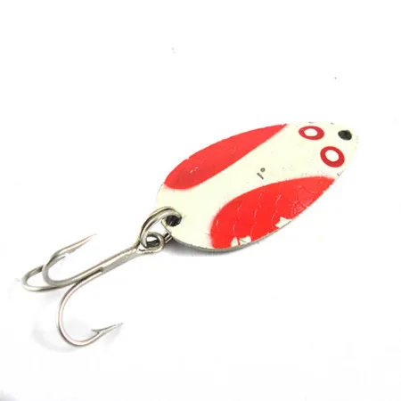 Con una medida de 1 1/2" (3,5 cm), la cara pintada de esta cucharilla presenta un distintivo patrón rojo y blanco, acentuado por detalles que imitan escamas y ojos circulares rojos cerca de la cabeza. La Wright & McGill Pay-Master, identificada con el código 0941, es un elemento básico de las cajas de pesca estadounidenses de mediados de siglo. Al dar la vuelta al señuelo se revela un acabado de níquel pulido donde el nombre de la marca y el peso de 1/4 oz (7 g) están profundamente troquelados en el metal. En su estado 4/5, la pintura permanece vibrante y los componentes, incluyendo la potera y la anilla, están bien conservados. La estructura del señuelo se basa en una hoja metálica en forma de lágrima que proporciona el peso necesario para lanzar en la zona de picada. Cada detalle, desde la marca clara en el reverso hasta la aplicación específica de la pintura, refleja los estándares de fabricación habituales en los EE. UU. El punto de enganche en la cabeza está perforado limpiamente, diseñado para anillas o clips estándar.