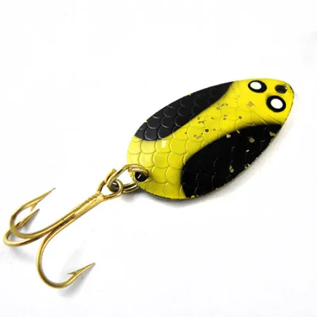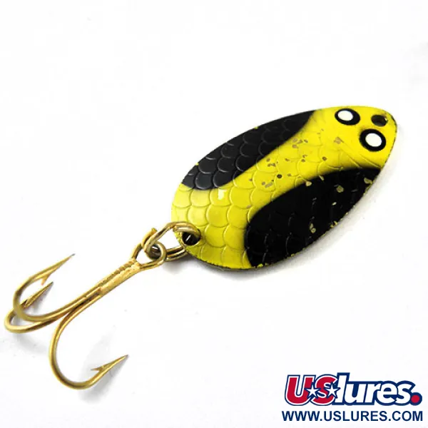 Grabado claramente en el reverso de latón, la marca 'WRIGHT & McGILL 'PAY-MASTER' 1/4 OZ' confirma la herencia estadounidense de esta cucharilla. Con una longitud de 1 1/2" (3,5 cm), la cucharilla muestra un llamativo patrón de escamas amarillas y negras que recuerda a una abeja, acentuado por dos distintivos ojos blancos en la cabeza. La pesada construcción de latón proporciona el peso de 1/4 oz (7 g) necesario para lanzamientos de larga distancia. Este modelo específico, bajo el código de producto 1054, se mantiene en un estado sólido de 4/5, con un acabado que conserva su vitalidad junto a su anzuelo triple original con acabado dorado. Históricamente, Wright & McGill aplicaba este acabado de escamas texturizadas para ayudar a captar la luz debajo de la superficie pintada. Los herrajes, incluidos el anilla abierta y el anzuelo, están limpios y firmemente sujetos.