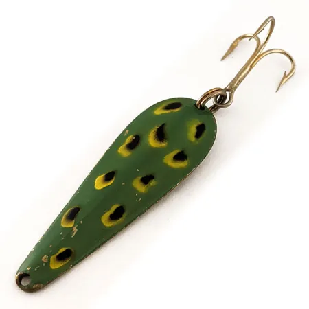 La construcción en latón constituye la base de esta cucharilla de 4,5 cm (1 3/4") con forma de lágrima. Grabadas directamente en el reverso del metal, las marcas Wright & McGill y Streamliner son nítidas y legibles, identificando este ejemplar específico con el código de producto 11704. El frontal está acabado con un patrón tradicional Frog, que presenta una base de color verde oliva oscuro decorada con manchas negras de borde amarillo que imitan a una presa natural. Con un peso de 7 g (1/4 oz), el señuelo está montado con un anzuelo triple de tono dorado sujeto por una anilla abierta en el extremo más ancho del cuerpo. Este artículo de pesca fabricado en EE. UU. muestra una calificación de estado de 5/5, con la pintura esmaltada conservando su brillo original y el reverso de latón con un aspecto limpio y reluciente. El perfil cónico del metal hacia el orificio para el sedal sugiere un diseño destinado al lance o al curricán en diversas condiciones de agua dulce.