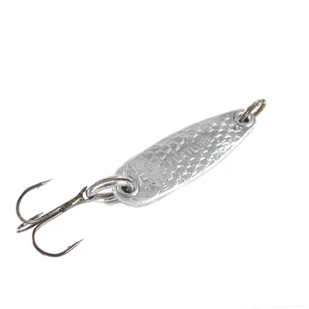 Con un patrón de escamas distintivo estampado en su cuerpo de metal, este Zip Flatlure de 44 g es un robusto señuelo de jigging vertical fabricado en EE. UU. Con una longitud de 6 cm, el señuelo presenta un acabado plateado pulido que resalta la superficie texturizada. Las letras en relieve 'FLATLURE' y 'TRADE MARK' permanecen nítidas en el lateral del metal, identificando este modelo específico producido en EE. UU. bajo el código de producto 1694. Este ejemplar se encuentra en condiciones 5/5, con una superficie brillante y herrajes bien conservados, incluidos los anillas originales. Se adjunta un único anzuelo triple en la cola, destinado al jigging en aguas profundas o técnicas de lanzado a larga distancia.