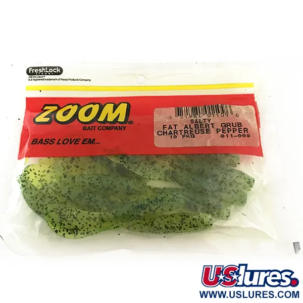 El Chartreuse Pepper es el color más destacado de estos ejemplares, con una base verde translúcida de alta visibilidad cargada de finas motas negras. Con una medida de 3 1/4" (8,25 cm), estos vinilos representan un diseño esencial de la Zoom Bait Company de Watkinsville, Georgia. El perfil del Fat Albert se caracteriza por un cuerpo robusto y muy anillado que se estrecha en una cola de hoz fina y ancha. Este paquete específico, identificado con el código de producto 6678, contiene 10 señuelos sin usar en su bolsa original con cierre de cremallera. La textura anillada del torso es una elección de diseño deliberada para aumentar la superficie, una característica común en los vinilos de fabricación estadounidense destinados al jigging. Cada grub de este lote muestra una saturación de color y una distribución de motas constantes en toda su longitud de 8,25 cm. El embalaje permanece intacto, mostrando la clásica cabecera roja y los datos del fabricante.